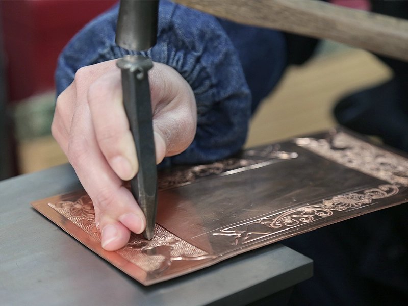長い歴史を誇る日本の伝統技術の一つ「川辺仏壇」や「薩摩彫金」をはじめ、お寺や神社の装飾金具を創る中で研ぎ澄まされた職人の目と手。