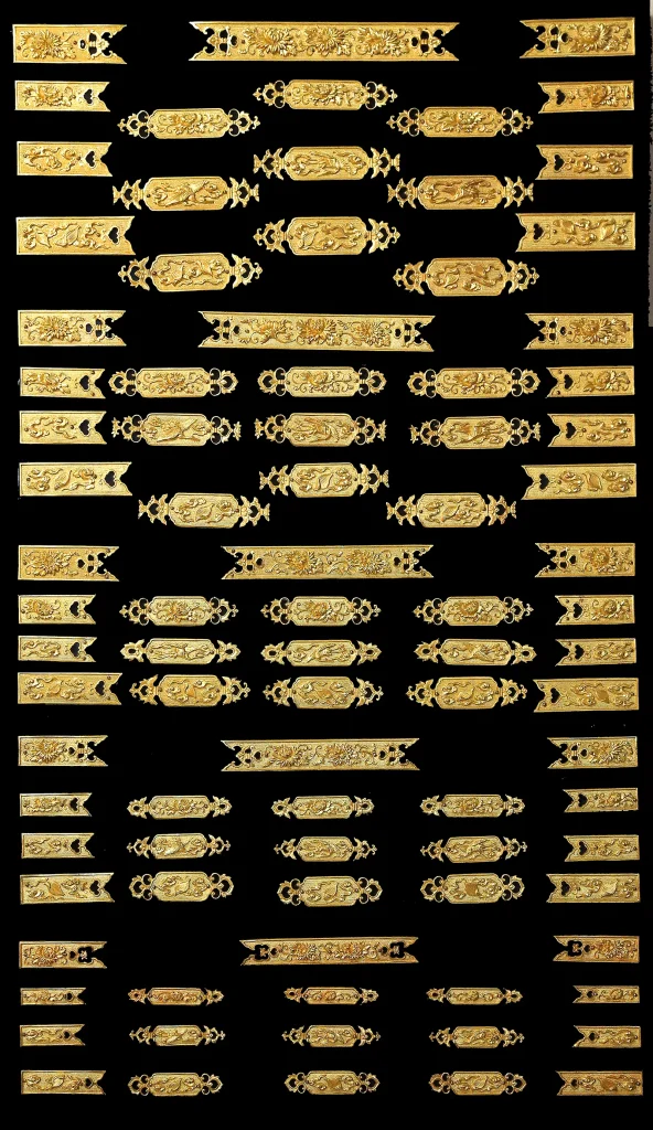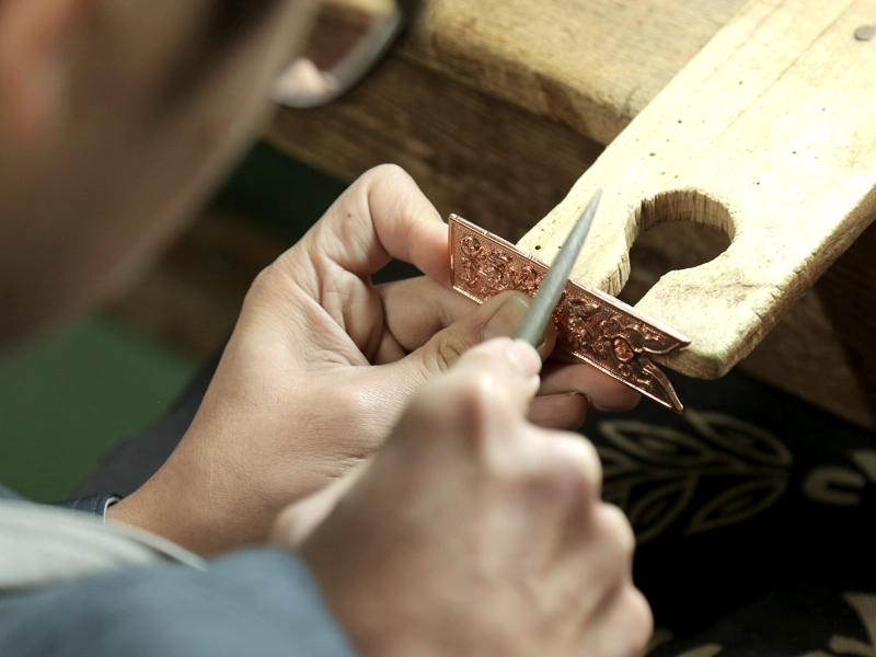 主に銅を用いて製作され、その後に金メッキなどの表面処理を施すことで、荘厳で格調高い輝きを永く保つ。優れた耐久性と高級感のある仏壇装飾金具や、寺院の柱などを荘厳に飾る装飾金具。