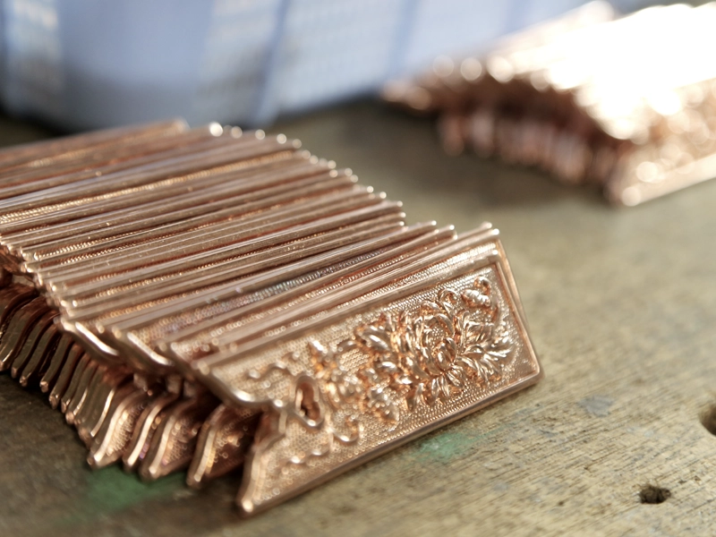 手造りの高級感と量産による効率性を両立させた装飾金具です。
